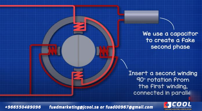 Therefore, we insert a second coil into the stator at 90 degrees of rotation from the first coil. The two coils are connected in parallel, but the second coil has a capacitor connected in series with the coil.